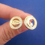 Round Space Themed Saturn Moon and Stars Rhinestone Stud Earrings in Gold