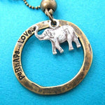 A very simple animal necklace featuring a charm in the shape of a small elephant in silver surrounded by a round hoop with the words "Perhaps ... Love" etched onto it.